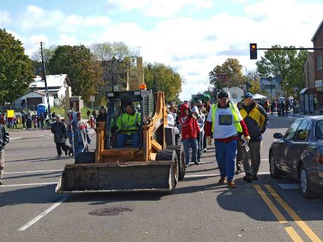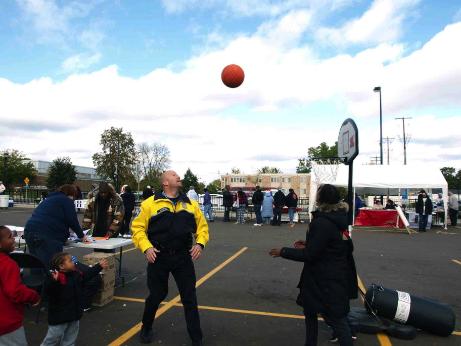 It was an unseasonably cold day for the Harvest Day Celebration on October 10 but Northsiders are hardy folks and came out to celebrate the official opening of the Lowry Corridor. Hennepin County officials held a short program and ribbon cutting, and then folks enjoyed the music, food, arts and entertainment, and kids had a blast at the Kids Zone. The last portion of Lowry Avenue - between Queen Avenue and Theodore Wirth Parkway - reopened in mid-August, two months ahead of schedule. The new corridor has on-street bicycle lanes, wider sidewalks, pedestrian lights, landscaped boulevards and intersection improvements. Reconstruction highlights include: 148,487-square feet of concrete sidewalk poured; 26,411 tons of bituminous paved; 405 trees planted; 151 high- and low-level lights installed; and 37 new fire hydrants installed. Pictured is the start of the celebration parade with a bobcat leading and the Henry High band behind. Also pictured is police officer Mike Kirchen playing ball with kids. Photos by Duane Attar.