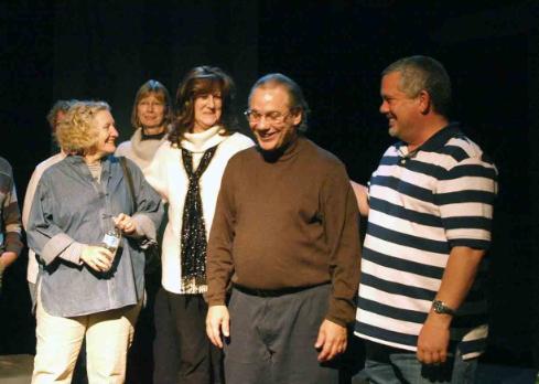 caption: 'night, Mother actresses Miriam Monasch and Muriel Bonertz, Director Richard Jackson and Stage Manager Jason Schaal (L-R, in foreground) were among those honored at an opening night reception for Workhouse Theatre's 100. Photo by Duane Atter.