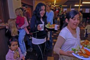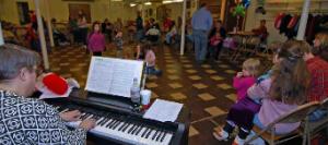 CAPTION: On February 13 Camden Music School held a children's sing-along and pizza party. Many families came to enjoy singing some favorite songs and eating tasty pizza from Papa's Restaurant and Deli. Mark your calendar for the Beatles Sing-Along on April 9. Photo by Randy Klauk.