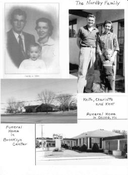 Meanwhile, Charlotte left teaching in April of ‘53 and their baby boy, Kent Howe Nordby, was born in July, 1953. Kent immediately became part of the building plans, being toted to Osseo every day, playing in his playpen, while mom painted walls, sewed draperies and did whatever was needed to finish the funeral home. One lucky thing was that the structure included an apartment. They lived there for 37 years. Their funeral home served an area of about 30 miles around Osseo.